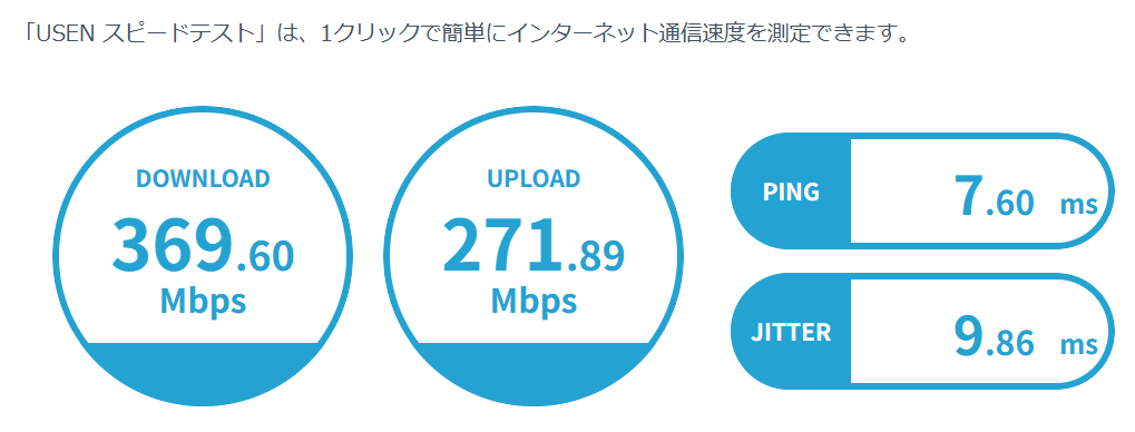 | 下り速度 | 53.75 Mbps | 369.60 Mbps (約7倍!) |